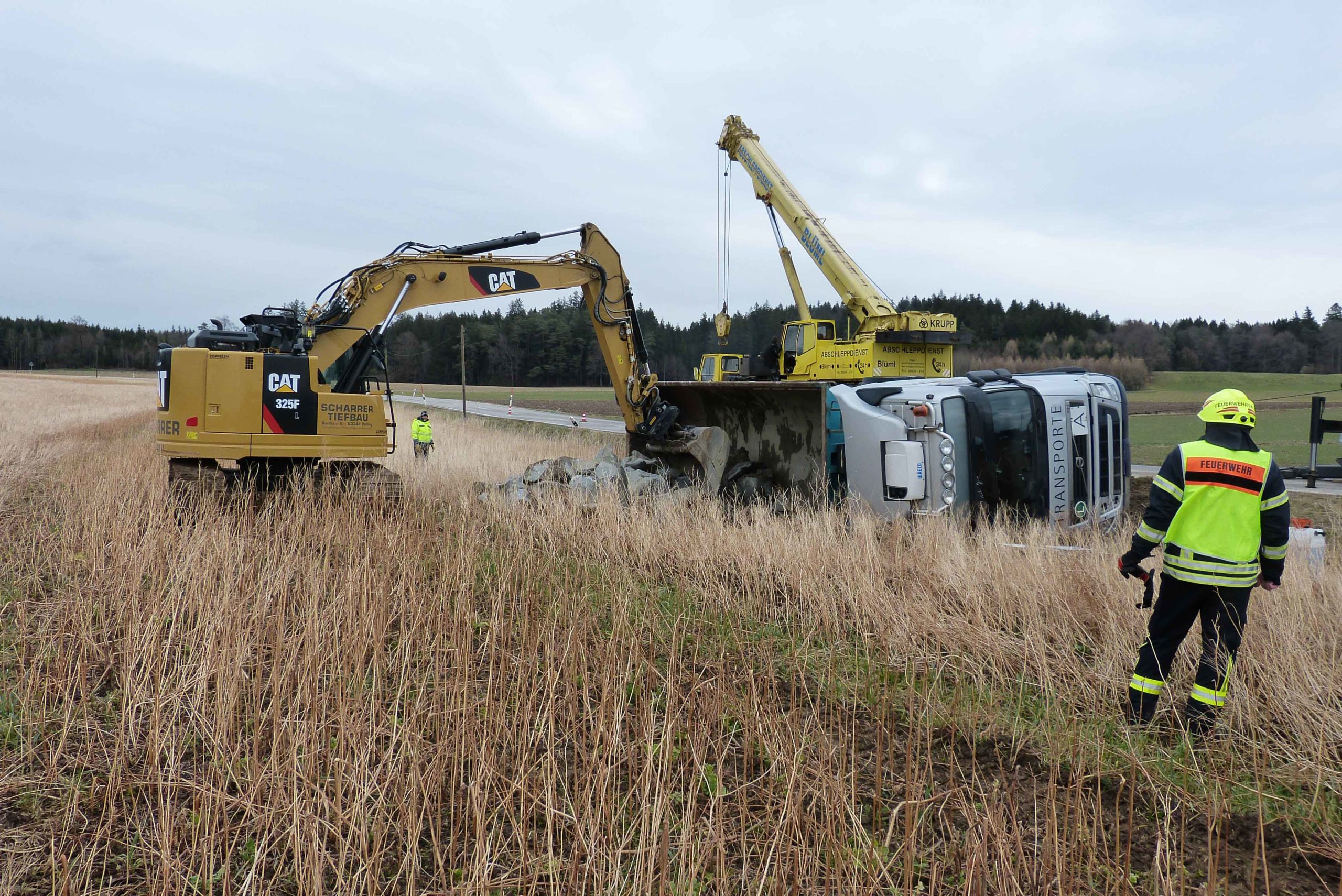 Zu einem umgestürzten LKW wurden wir am 03.03.2020 gegen 11:30 Uhr mit dem Stichwort „ABC Kraftstoff“ – auslaufende Betriebsstoffe auf die St 2093 höhe Holzbrunn alarmiert. Die Polizei und das Abschleppunternehmen waren zu diesem Zeitpunkt schon vor Ort. Da direkt über dem LKW eine oberirdische Telefonleitung verlief konnte sich der Bergekran nicht positionieren, daher montierten wir diese mit der HRB ab. Zur Unterstützung wurde ein Bagger eines Ortsansässigen Fuhrunternehmens geordert, der den mit Granit geladenen Auflieger leerte, das kontaminierte Erdreich abtrug und anschließend mit frischer Erde auffüllte. Der Fahrer des LKW wurde bei dem Unfall glücklicherweise nicht verletzt.