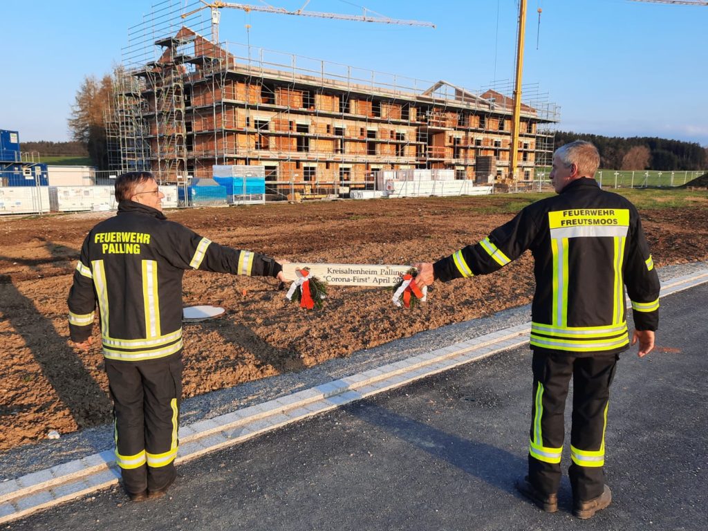 So wurde das Interesse der Vorstandschaften der beiden Freiwilligen Feuerwehren Palling und Freutsmoos geweckt, als sie das imposante, aus dem Boden sprießende Kreisaltenheim Palling, betrachteten. Besonderes Augenmerk legten die Beteiligten dabei auf ein ganz bestimmtes Bestandteil des Dachstuhls.